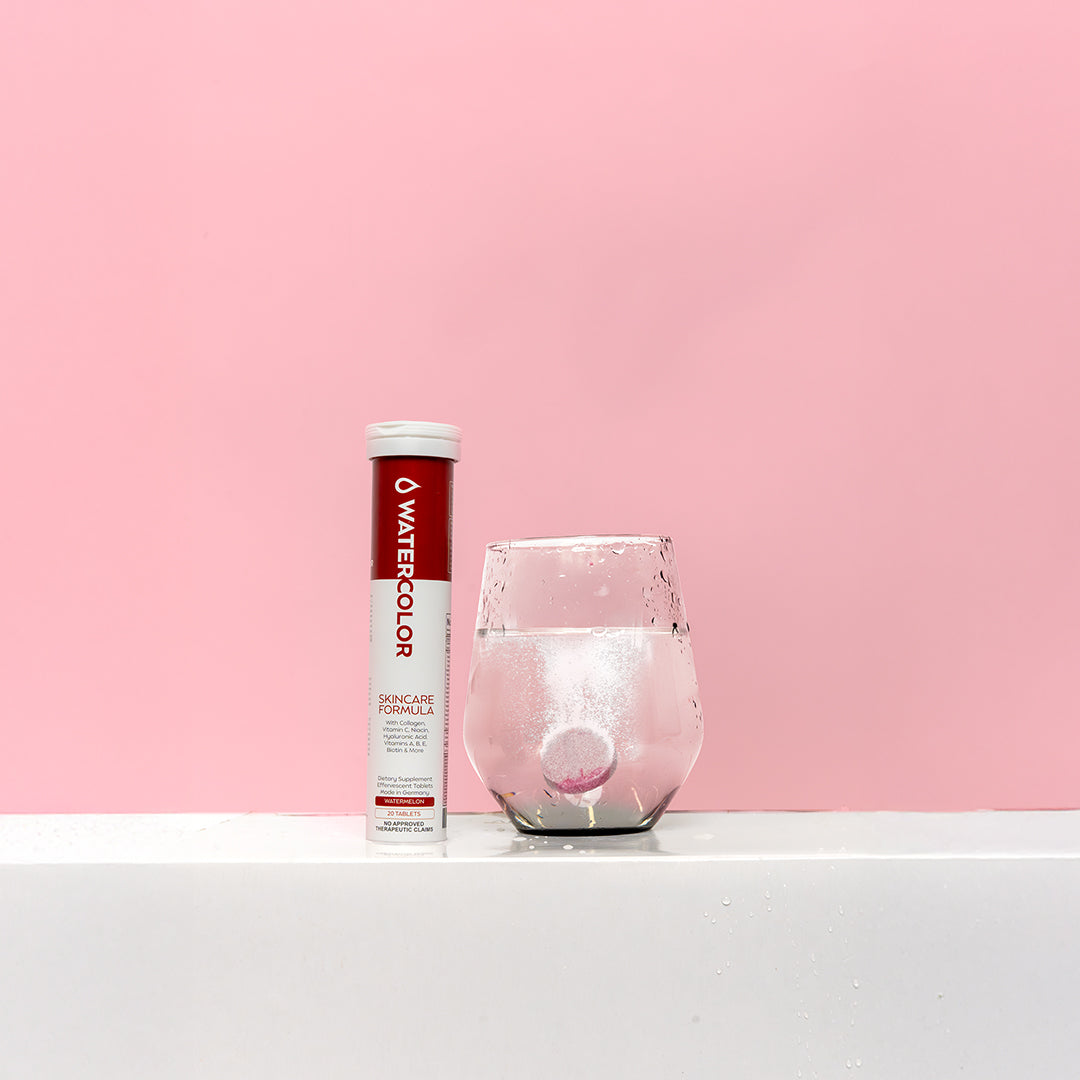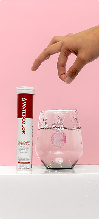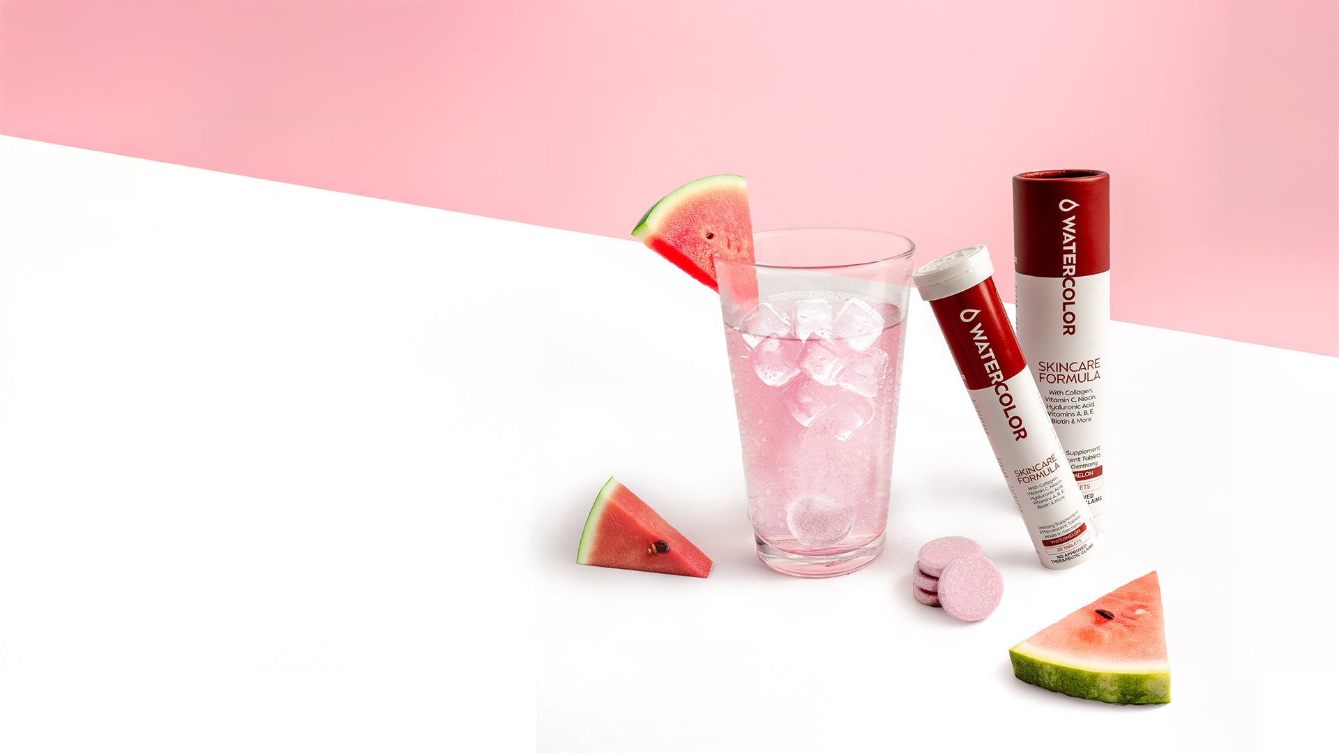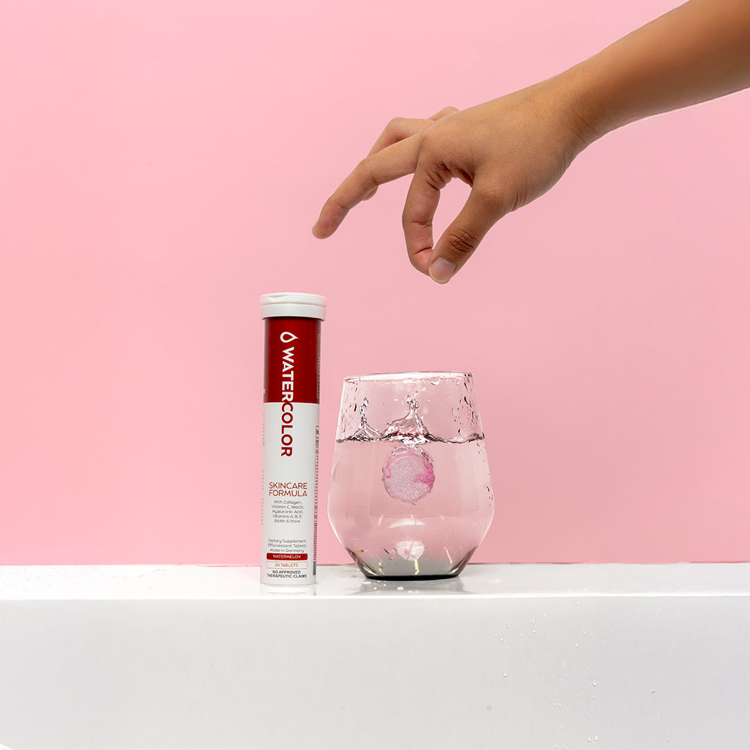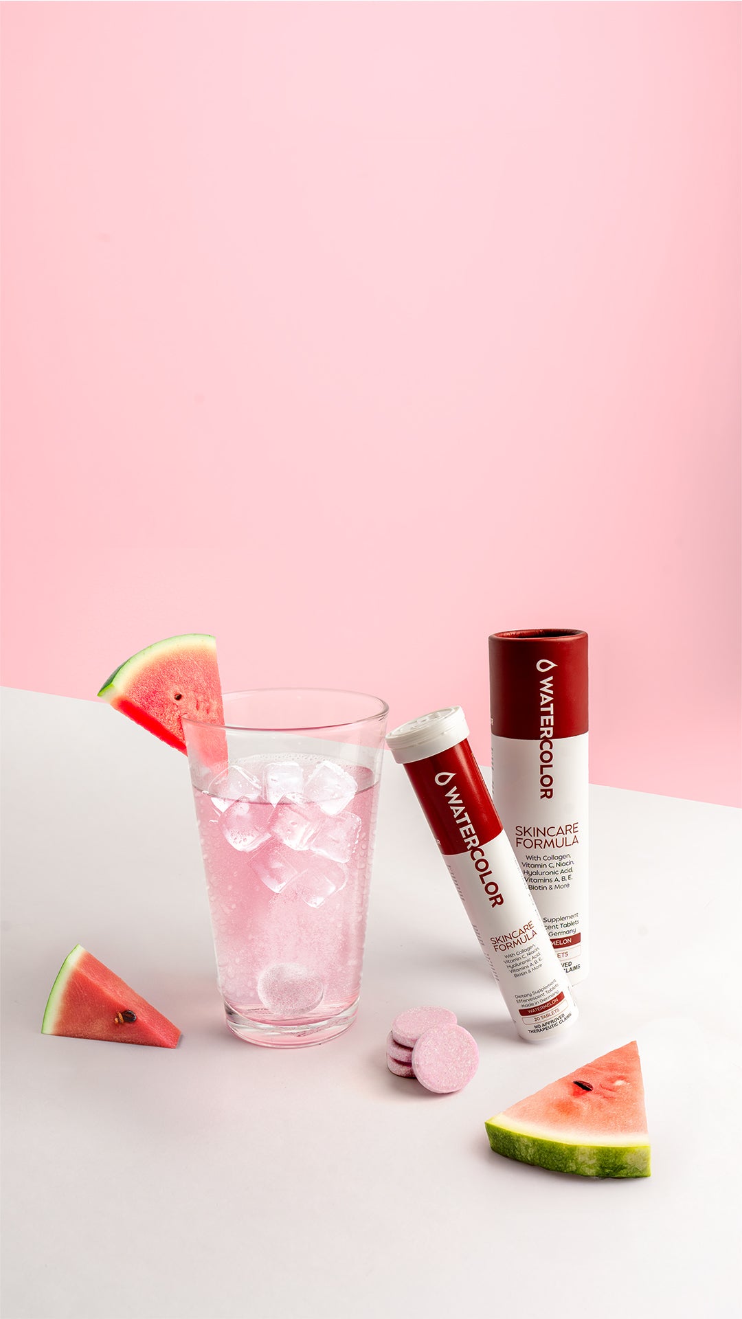 Drink 1 glass of water every morning. Add 1 tablet of Skincare Formula to it. Enjoy the fresh Watermelon flavor. Get hydrated. And cover all your skincare routine with 1 product.